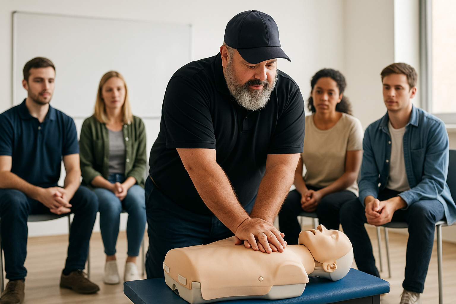 Four people practicing CPR on a training dummy, with an instructor demonstrating chest compressions, in a classroom setting.
